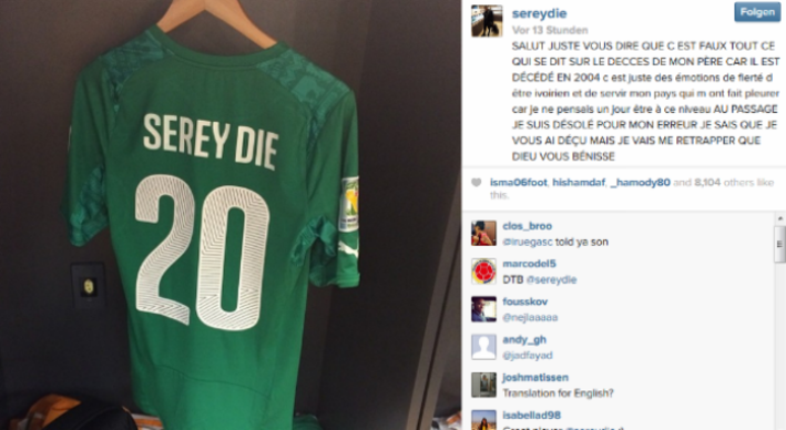 Die Tränen von Basel-Crack Geoffroy Serey Die gingen gestern um die Welt (infoticker.ch berichtete). Der 29-jährige Ivorer brach bei der Nationalhymne vor dem WM-Gruppenspiel gegen Kolumbien (1:2) am Donnerstag in Tränen aus - angeblich weil sein Vater zwei Stunden vor Spielbeginn verstorben sei.